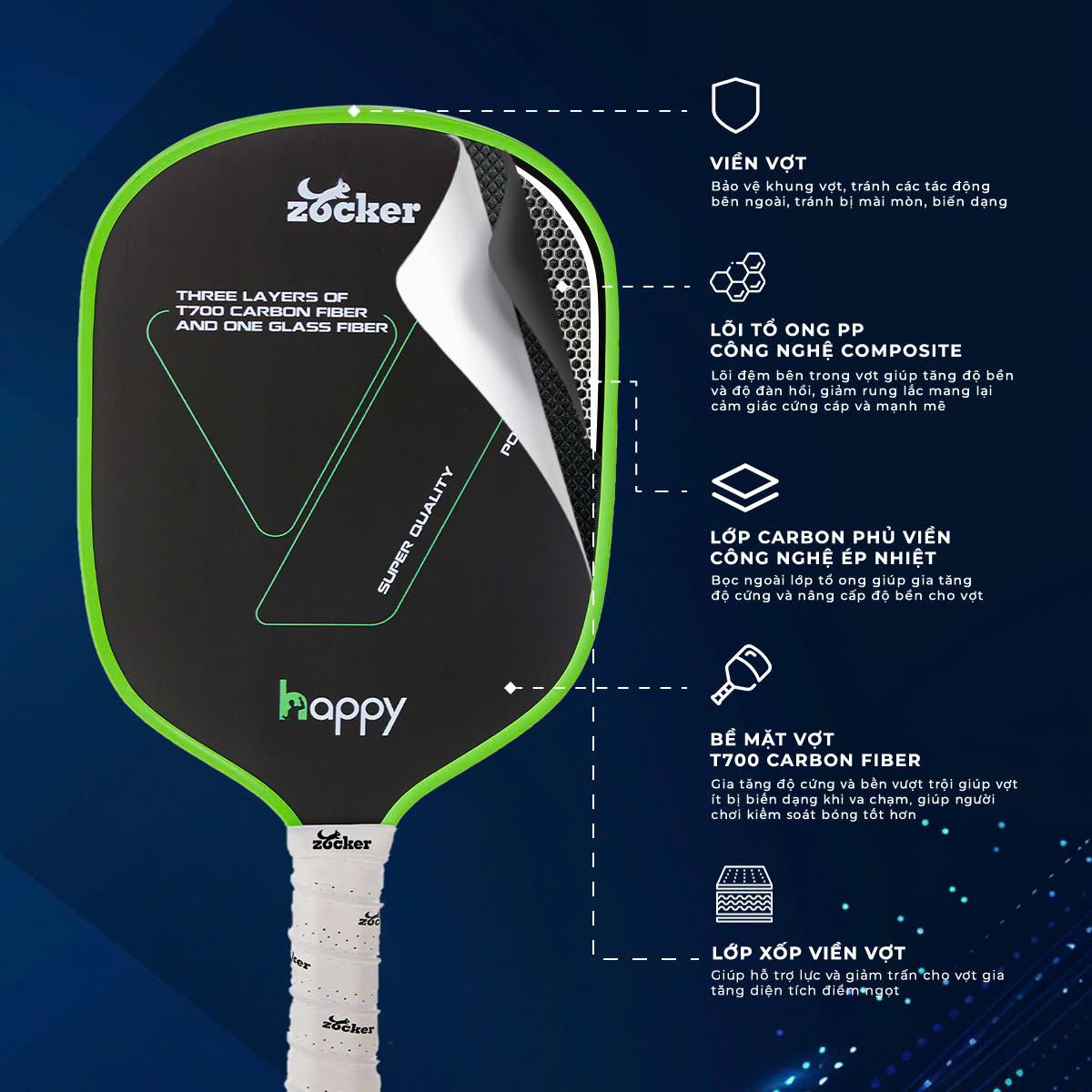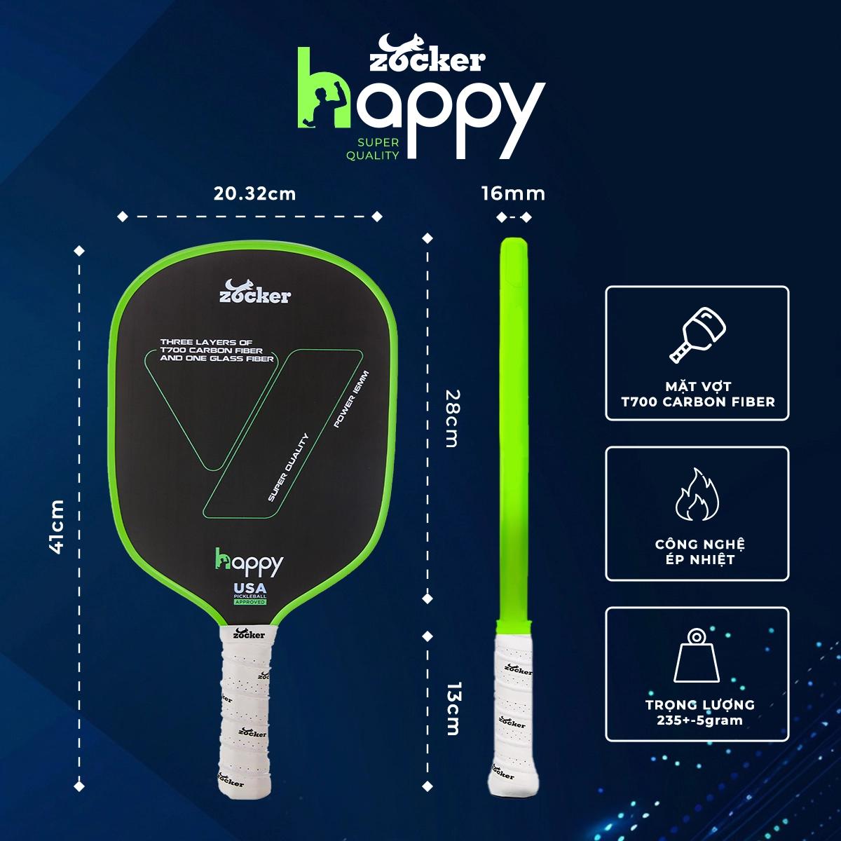 Vợt Pickleball Zocker Happy HP2 Super Quality là vợt T700 tốt nhất công thủ toàn diện, là món đồ không thể thiếu cho những ai yêu thích bộ môn này.